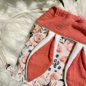 • Sac à dos pochon « BUNNY Roses et Gaze Corail»