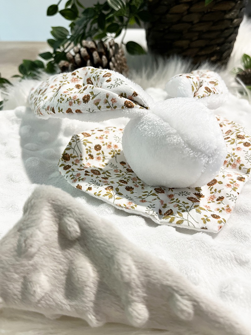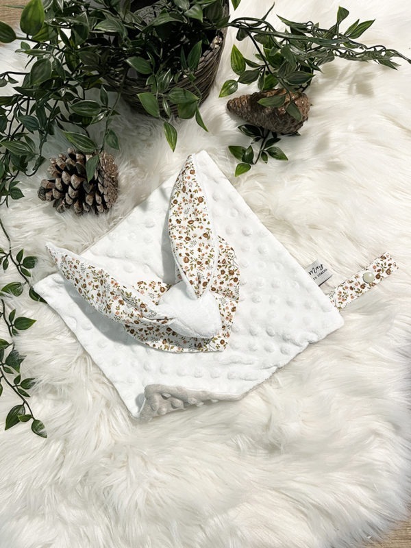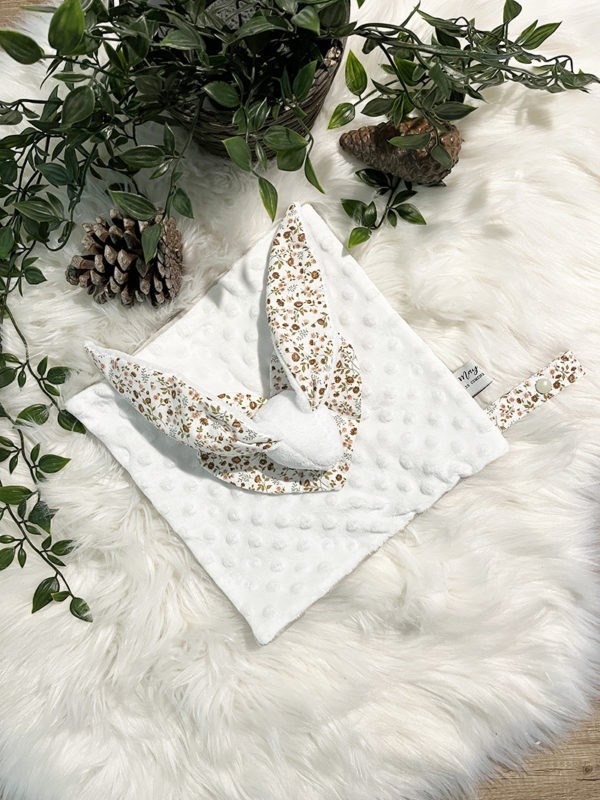 La tete est en tissu polaire doudou, la collerette “coeur” est en coton imprimé doublé de tissu nid d’abeille, enfin le carré doudou est composé de deux épaisseurs de Minky Bubble (dessus blanc naturel / dessous beige clair)