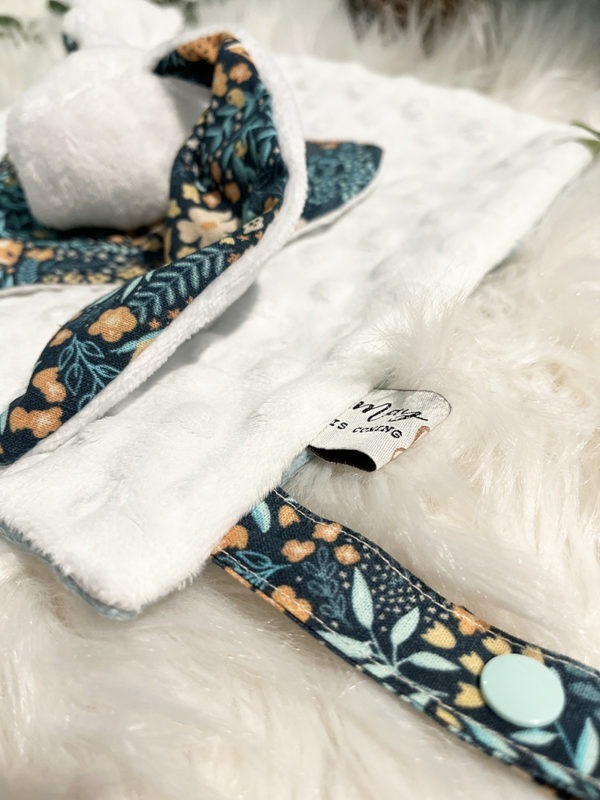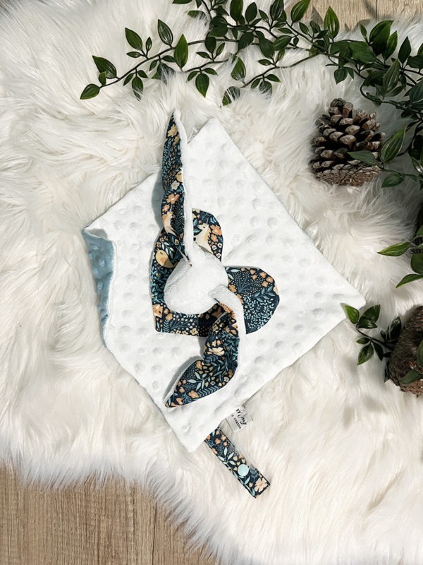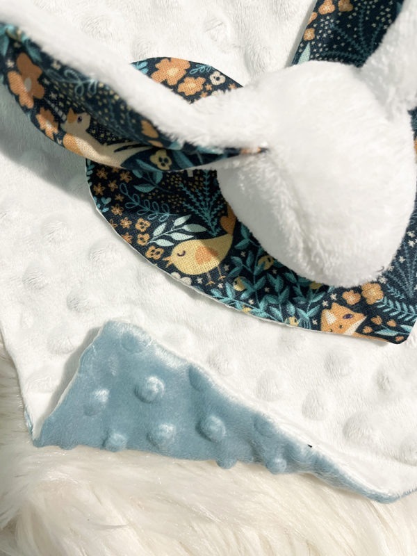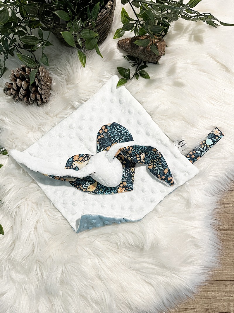 La tete est en tissu polaire doudou, la collerette “coeur” est en coton imprimé doublé de tissu nid d’abeille, enfin le carré doudou est composé de deux épaisseurs de Minky Bubble.