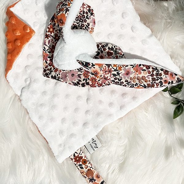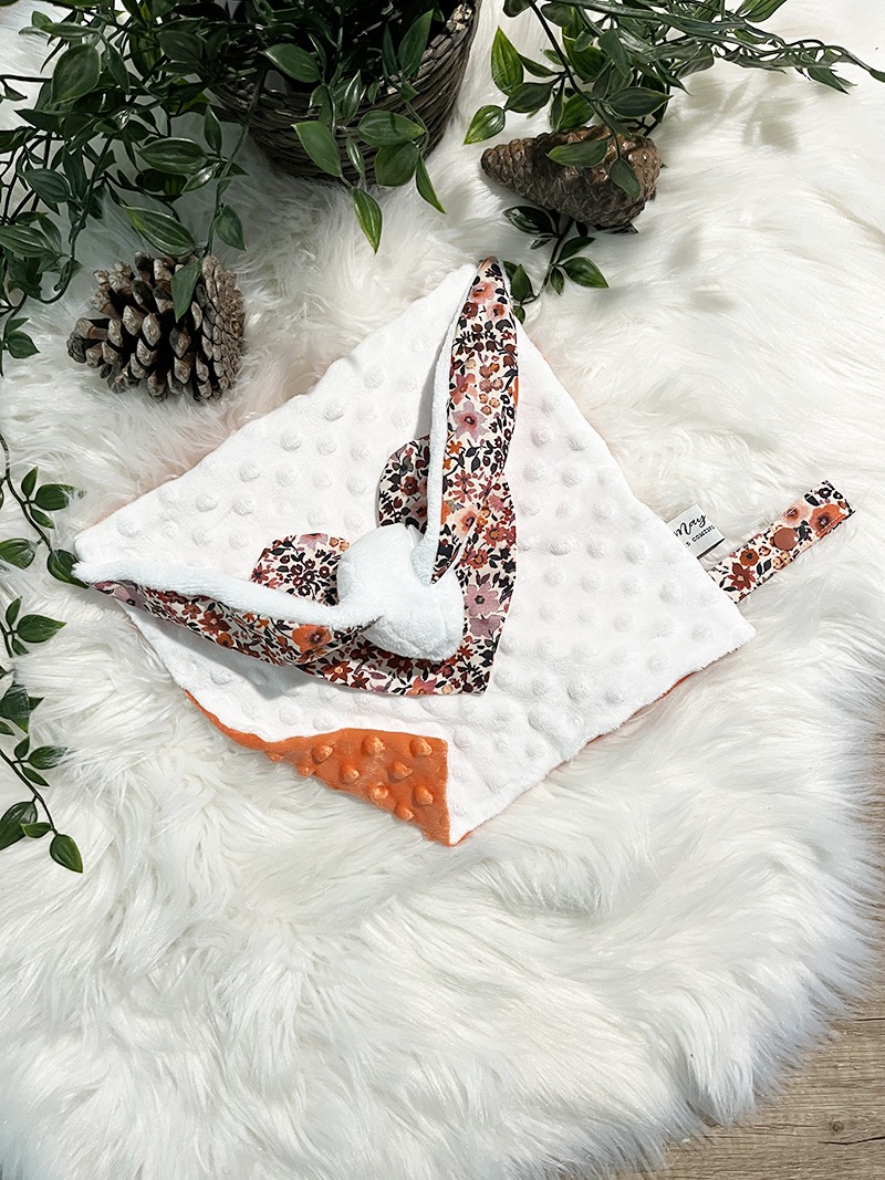 La tete est en tissu polaire doudou, la collerette “coeur” est en coton imprimé doublé de tissu nid d’abeille, enfin le carré doudou est composé de deux épaisseurs de Minky Bubble (dessus blanc naturel / dessous Corail)