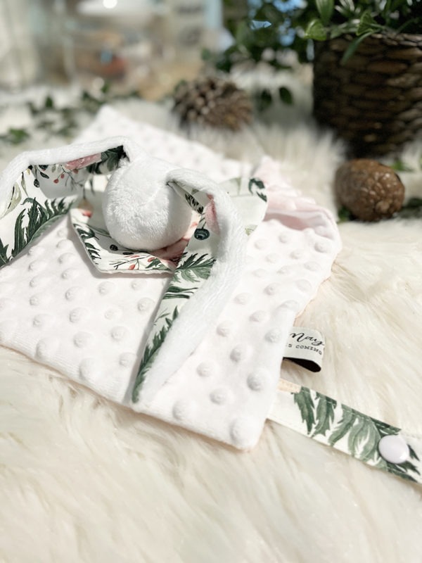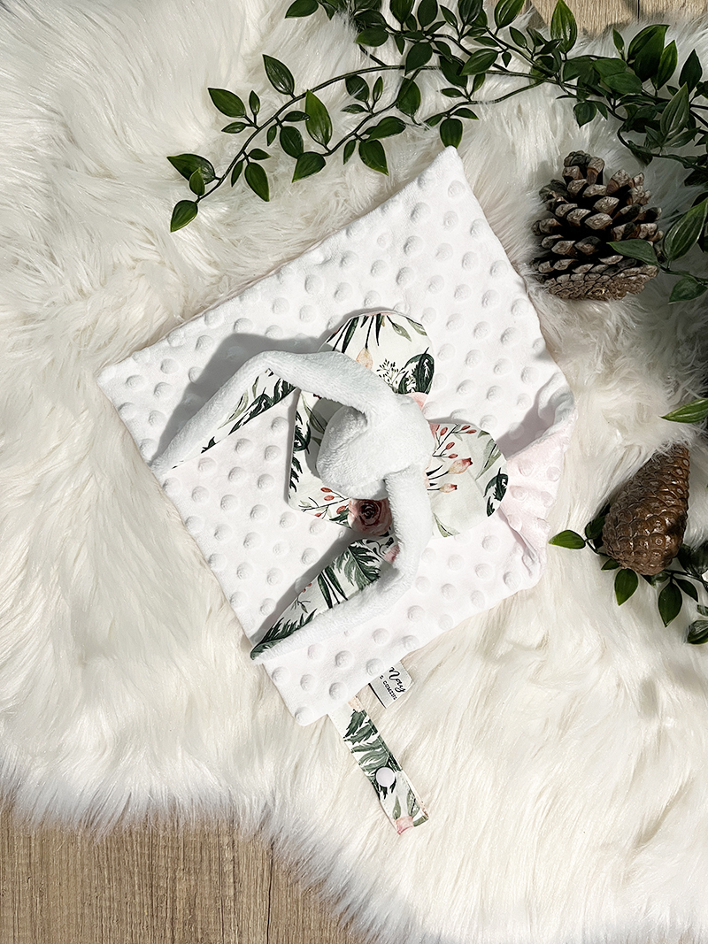 La tete est en tissu polaire doudou, la collerette “coeur” est en coton imprimé doublé de tissu nid d’abeille, enfin le carré doudou est composé de deux épaisseurs de Minky Bubble.